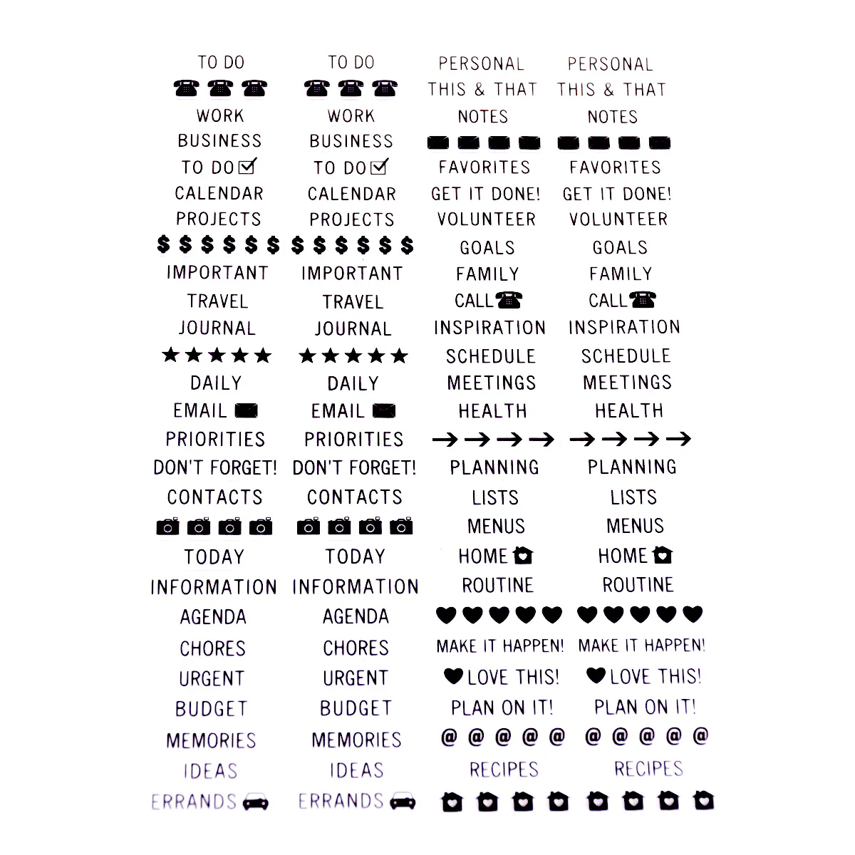 Included in the pack is a range of labels including: Pets, friends, exercise, birthdays, urgent, under review, to-do, personal, calendar, projects, daily, journal etc. The stickers are clear with black writing to not distract from your beautiful planner pages!