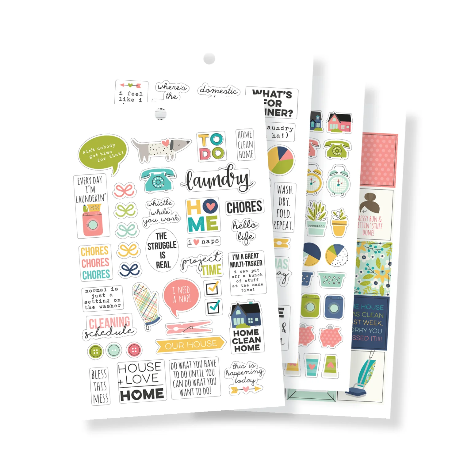 The sticker tablet has 725 stickers over 12 sheets including stickers for planning your week, keeping on track of bills, chores, and tasks all related to the home.